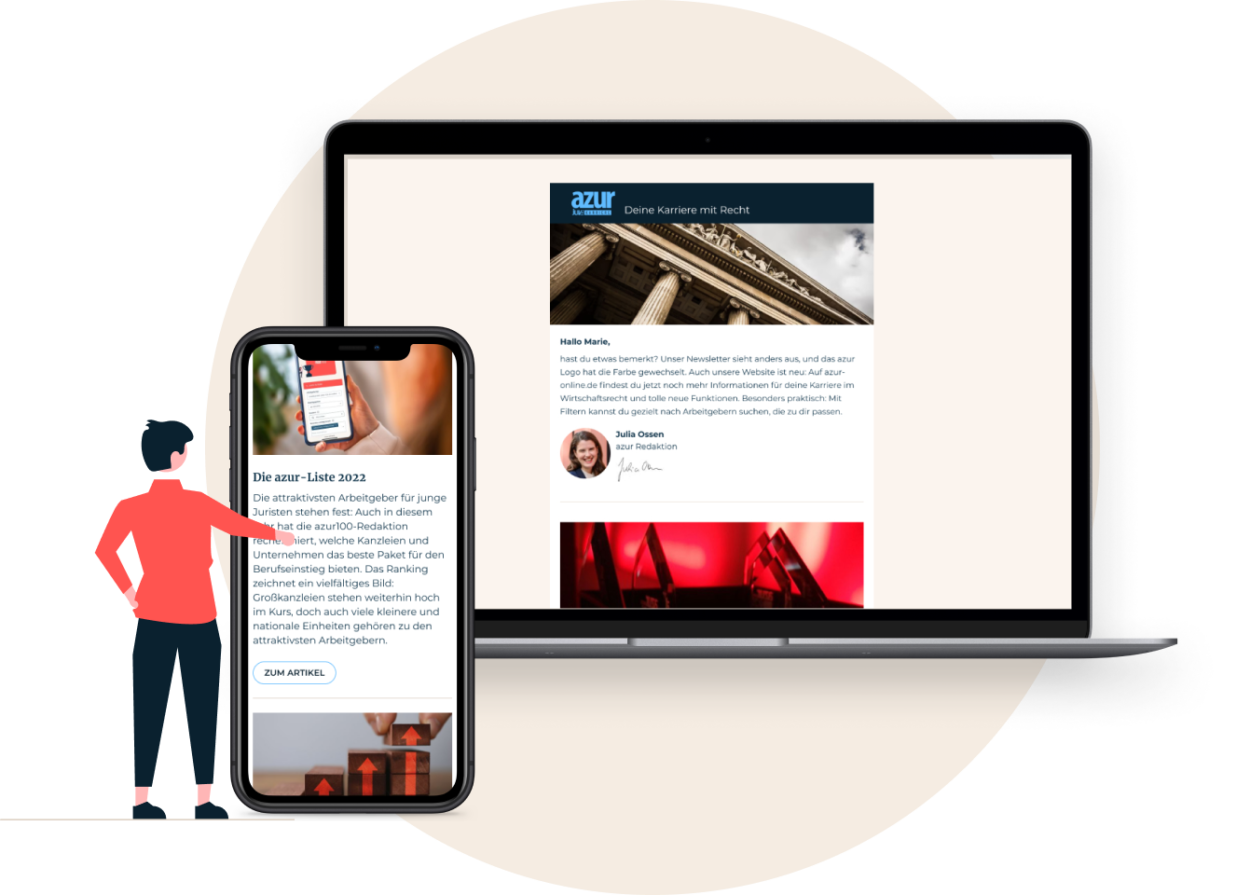 Informiere dich einmal im Monat kostenlos mit dem Karriere-Newsletter aus dem JUVE Verlag. Bei uns liest du Neuigkeiten zu den Themen Studium, Referendariat und Karriere.