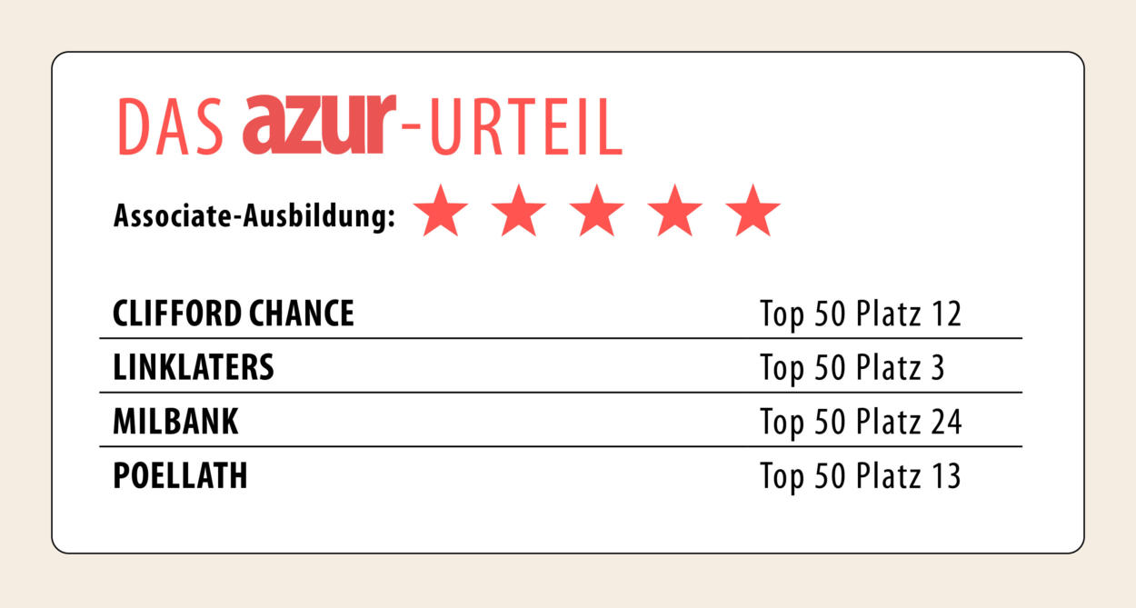 Besonders umfassend ist nach Recherchen der azur-Redaktion die Ausbildung in Großkanzleien wie Clifford Chance und Linklaters. Teilnehmende der Associate-Umfrage loben bei Clifford sowohl „spannende und fordernde Mandate“ sowie die „umfangreiche Ausbildung“. Die etablierte Academy der Kanzlei bietet zahlreiche Trainings zu Business Skills wie Client Relations oder Negotiation Skills, Kommunikationstrainings und BWL-Kurse sowie eine eigene Lern-App, mit der Associates jederzeit online lernen können. Bei Linklaters profitieren Berufseinsteiger unter anderem vom umfänglichen Soft-Skills-Trainingsprogramm, Seminaren zu Corporate & Finance sowie Trainings und sogar Podcasts zum Thema Legal Project Management.