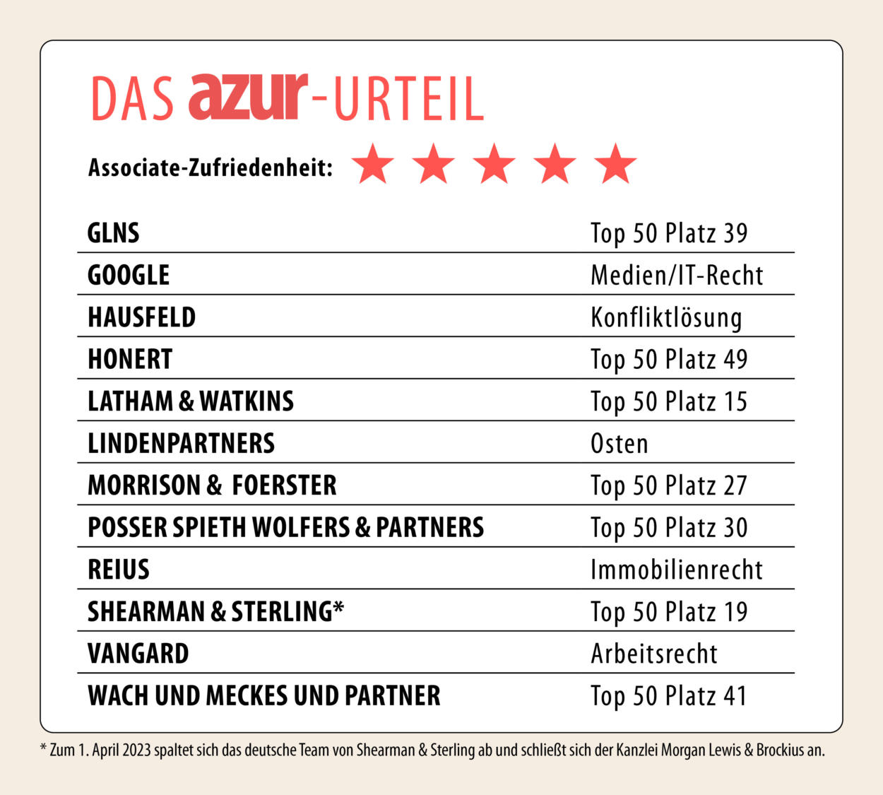 Großen Einfluss auf die Zufriedenheit am Arbeitsplatz hat für Associates die Stimmung in den Teams, in denen sie arbeiten und der Umgangston mit Partnerinnen und Partnern. Für das Betriebsklima vergeben bei Shearman & Sterling, Reius, GLNS, Lindenpartners und Wach und Meckes und Partner alle Teilnehmenden der Associate-Umfrage Bestnoten.