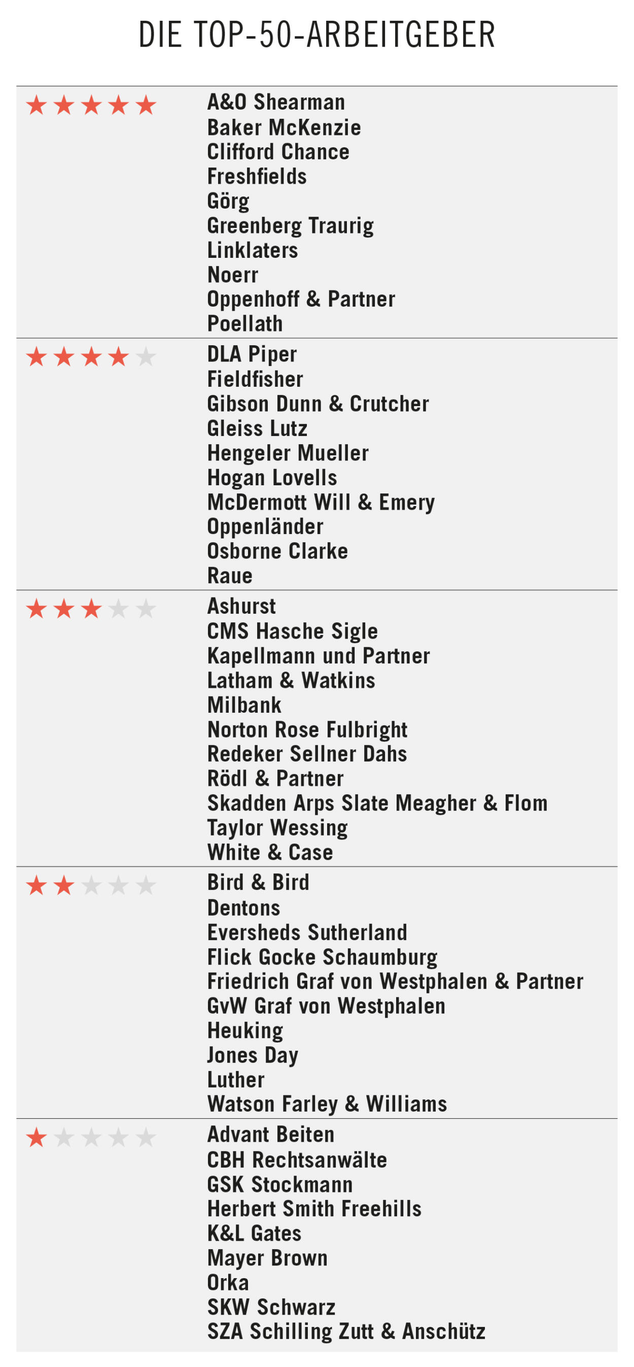 Die azur-Redaktion erstellt das Top-50-Ranking Jahr für Jahr neu – weniger mit dem Blick auf Zahlen und mehr in vergleichender Perspektive mit Blick auf den gesamten Rechtsmarkt. Anders als bislang besteht dieses Top-50-Ranking nun ausschließlich aus Kanzleien. Da jedoch auch Rechtsabteilungen interessante Perspektiven für Juristinnen und Juristen bieten und diese dort oft ganz besonders gute Arbeitsbedingungen vorfinden ( Prima Betriebsklima, Seite 26), stellen wir erstmals die zehn empfehlenswertesten Rechtsabteilungen in einem eigenen Kapitel vor. Weitere 40 Arbeitgeber, die besonders regional verankert sind oder sich auf ein Rechtsgebiet spezialisiert haben, bewertet die Redaktion ebenfalls im zweiten Teil dieses Hefts. Informationen dazu, welche Arbeitgeber in einzelnen Kategorien wie Neueinstellungen ( Die Top-Einsteller, Seite 43), Gehalt ( Willkommen im Club der Top-Zahler, Seite 29) und Zufriedenheit der Associates ( Wo die glücklichsten Associates arbeiten, Seite 37) am besten abschneiden, finden sich nun in separaten Artikeln.