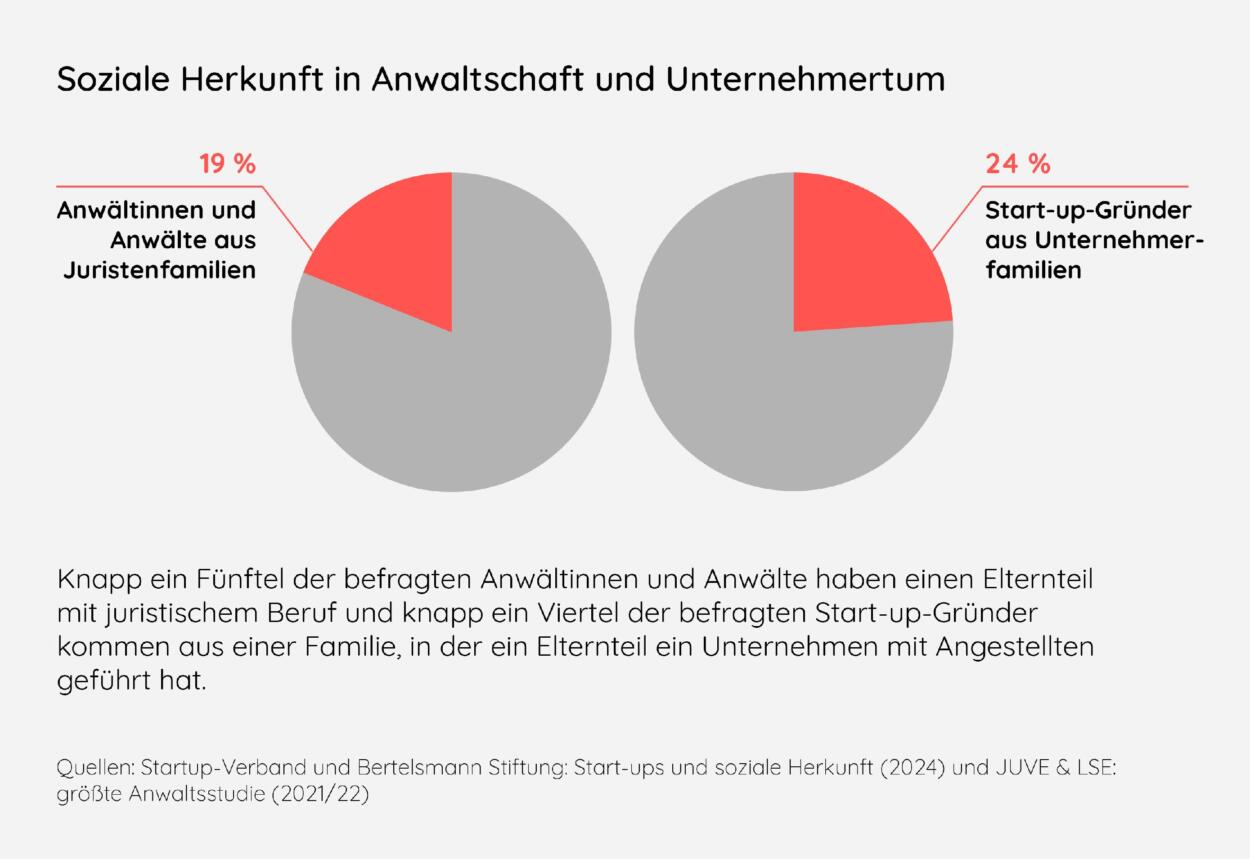70 Prozent der Berufsträger kamen aus Elternhäusern mit akademischem Hintergrund. Etwa 20 Prozent der in der LSE-Studie befragten Anwälte wuchsen in Juristenfamilien auf. Die Vorbildrolle der Eltern wirkt auch bei den Gründern. So hat ein Viertel der befragten Start-up-Gründer Eltern, die selbst schon Unternehmen mit Angestellten geführt haben.