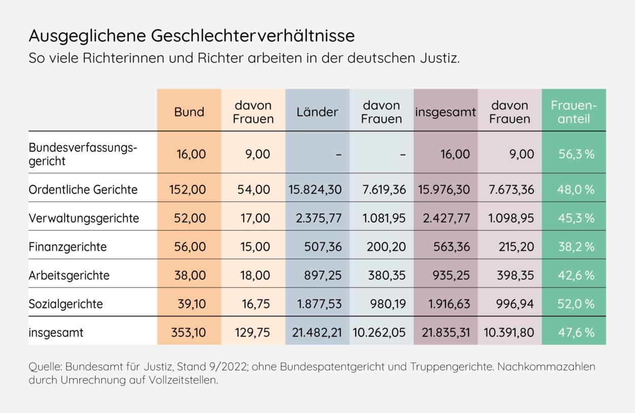Anders als in Kanzleipartnerschaften sind die Geschlechterverhältnisse im Richteramt ausgeglichen. So urteilen in 47,6 % der Gerichtssäle in Deutschland Richterinnen.
