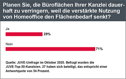 Zum Vergleich: Vor der Krise arbeiteten im Durchschnitt nur 5 Prozent der Anwälte einer Top-50-Kanzlei im Homeoffice – und zwar in der Regel dann, wenn Handwerker erwartet oder Kinder betreut wurden. Jede dritte Kanzlei gab in der Umfrage an, dass vor der Krise kein einziger ihrer Anwälte zu Hause arbeitete.