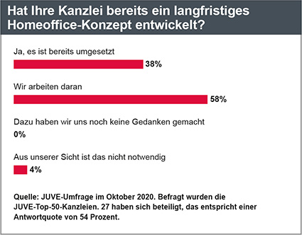 Doch schon die Erfahrungen aus dem ersten Lockdown haben bei vielen Kanzleien zu einem Umdenken geführt: Homeoffice soll künftig nicht mehr nur in Ausnahmefällen erlaubt sein, sondern selbstverständlicher Bestandteil des Arbeitsalltags werden. Laut JUVE-Blitzumfrage haben 38 Prozent der Top-50-Kanzleien bereits ein langfristiges Homeoffice-Konzept entwickelt und umgesetzt, 58 Prozent der Befragten arbeiten noch daran.