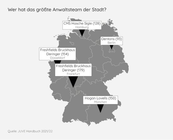 In Frankfurt dagegen wuchsen die Büros der zehn größten Kanzleien im selben Zeitraum kaum. Frankfurt ist auch die einzige unter den fünf wichtigsten Anwaltsmetropolen in Deutschland, in der die Zahl der Partner in den zehn größten Kanzleibüros sogar gesunken ist. Nach wie vor hält Freshfields dort das größte Büro.