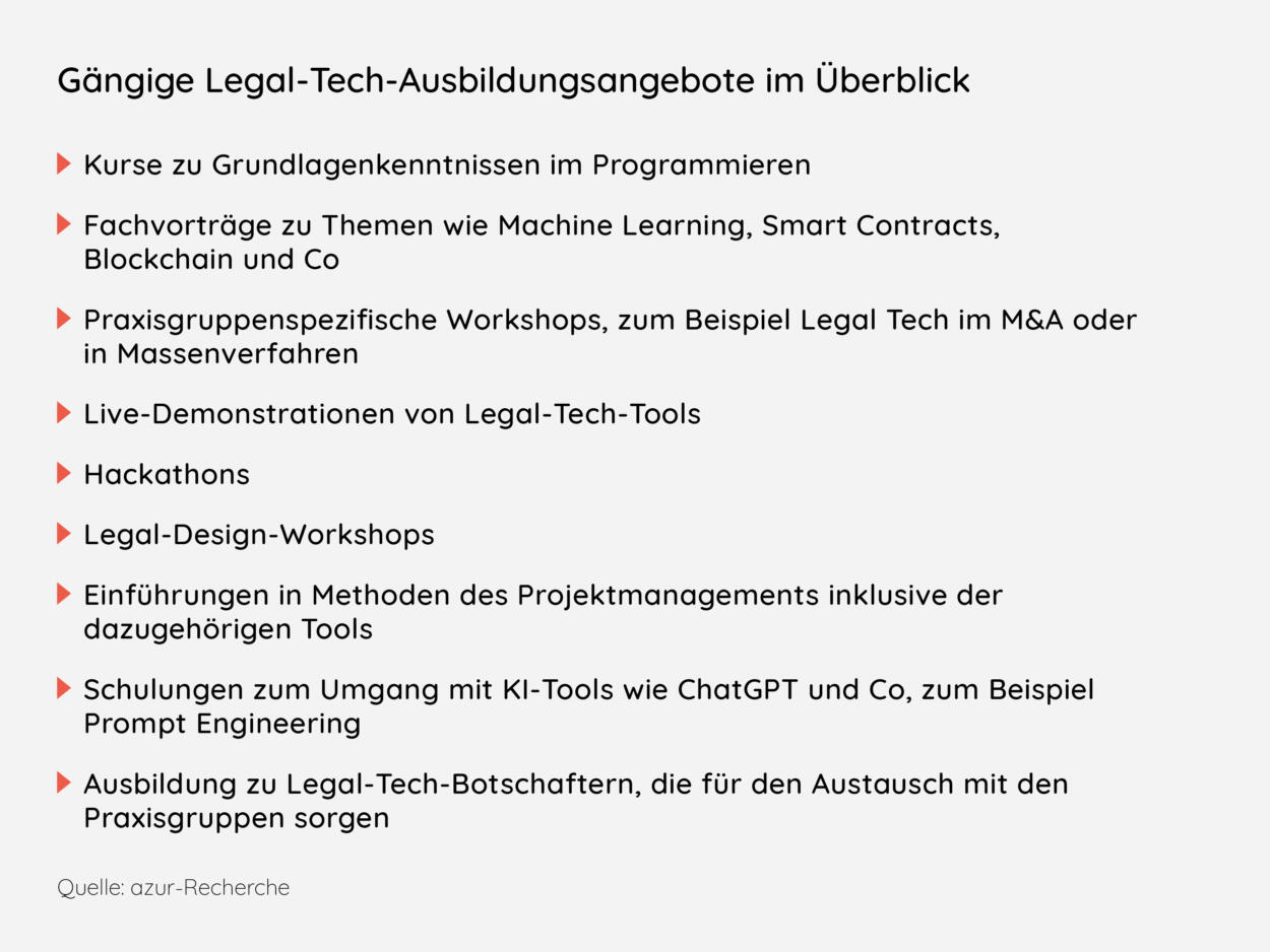 Vor allem in großen Kanzleien sind die Angebote zur Legal-Tech-Ausbildung schon jetzt sehr ausgeklügelt. Das beginnt bereits beim Onboarding: Bei Hengeler Mueller etwa lernen alle Neueinsteigerinnen und Neueinsteiger die Arbeit des Legal-Tech-Centers der Kanzlei kennen und werden in den gängigen Tools geschult. Auch Noerr oder Linklaters wollen den Nachwuchs früh an die softwaregestützte Arbeit gewöhnen. Linklaters hat dafür eine Schulungsreihe aufgesetzt, in der sie Anwältinnen und Anwälten Legal-Tech-Applikationen und Anwendungsfälle vorstellt und zeigt, welche Prozesse und Arbeitsschritte mithilfe der Tools effizienter werden können.