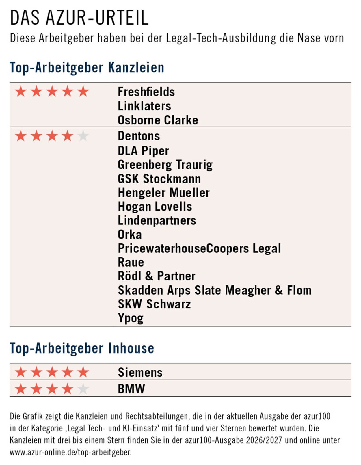 Die Marktspitze der Top-Kanzleien baut strukturierte Kompetenzen auf und integriert Legal Tech in die tägliche Mandatsarbeit, während das Mittelfeld überwiegend reaktiv agiert und isolierte Lernformate ohne nachhaltige Wirkung nutzt. Innerhalb der Spitzengruppe stechen Freshfields, Osborne Clarke und Linklaters mit fünf Sternen im azur100-Ranking besonders hervor, da sie Legal Tech nicht nur als Kompetenz, sondern als strategischen Bestandteil der juristischen Wertschöpfung verstehen. Bei den Rechtsabteilungen hat derzeit Siemens die Nase vorn und überzeugt durch einen Mix aus modernen Tools und Praxisnähe.