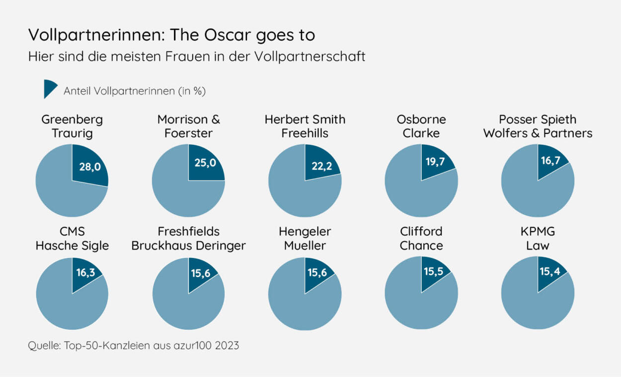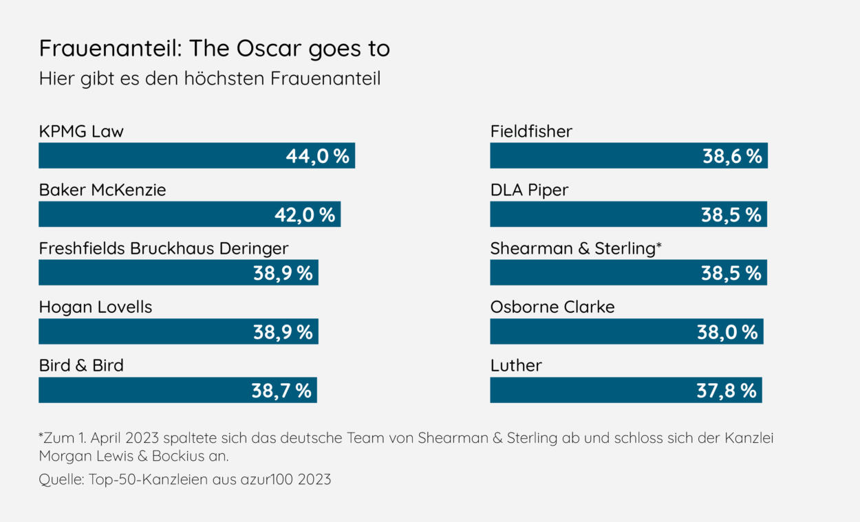 Es gibt aber auch Lichtblicke im Kanzleimarkt: KPMG Law etwa kann bei der Gesamtquote der Anwältinnen ordentliche 44 Prozent verzeichnen, Baker McKenzie 42 Prozent. Greenberg Traurig ist Spitzenreiterin mit ihrem Frauenanteil in der Vollpartnerschaft, der dort immerhin 28 Prozent beträgt. Was machen sie anders?
