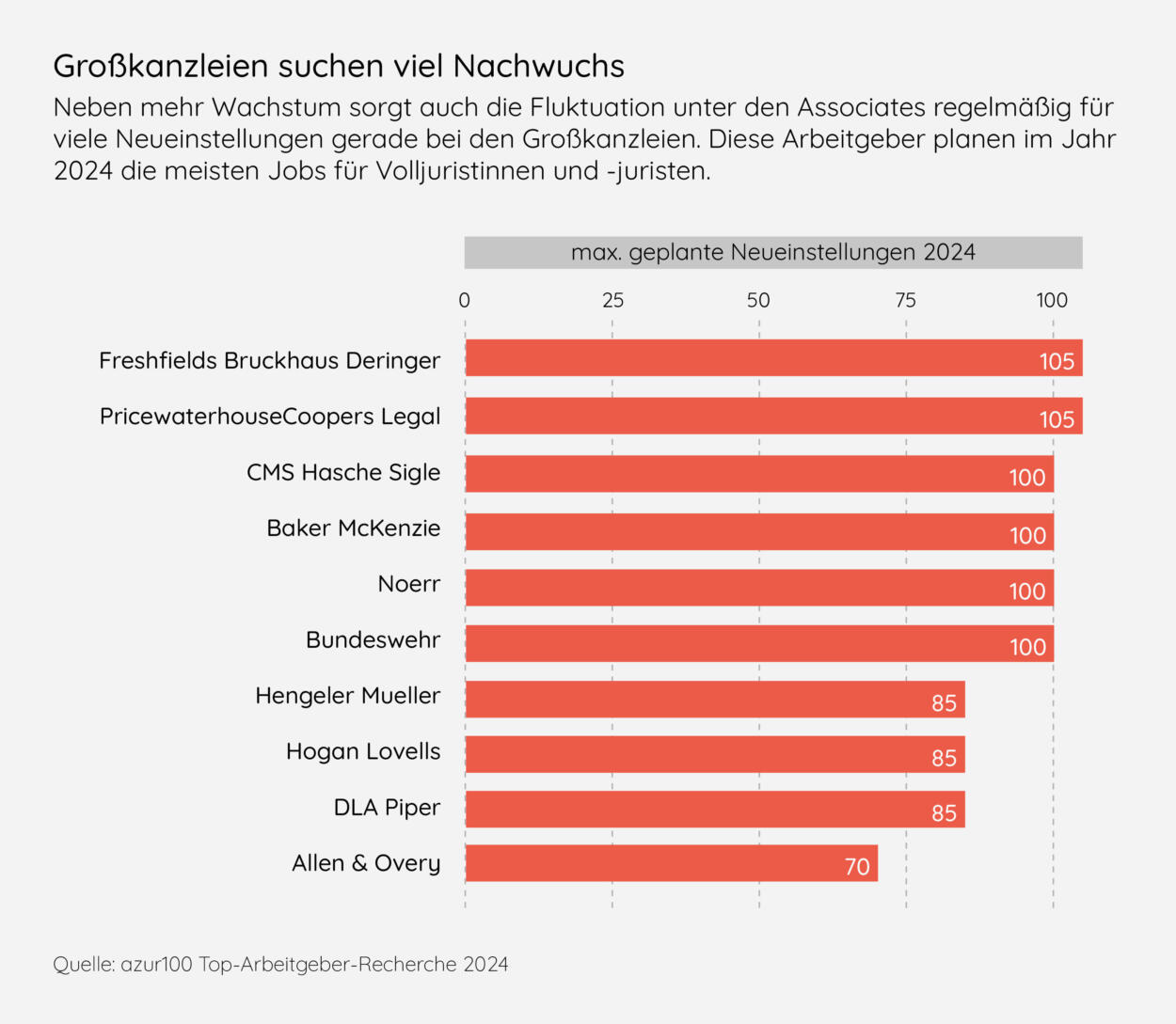 Naturgemäß sind es vor allem die Großkanzleien, die jedes Jahr einen enormen Bedarf an neuen Associates haben. So planen Freshfields Bruckhaus Deringer, PricewaterhouseCoopers Legal, CMS Hasche Sigle, Baker McKenzie und Noerr mit jeweils bis zu 100 Neueinstellungen im Jahr 2024. Die Neueinstellungen führen nicht immer zu einem weiteren Wachstum der größten Sozietäten, sondern diese besetzen regelmäßig auch Stellen nach. Denn junge Associates wechseln im Laufe ihrer Karriere durchaus den Arbeitgeber. Mit der Bundeswehr ist aber auch ein öffentlicher Arbeitgeber unter den Top-Einstellern des Jahres 2024. Sie plant ebenfalls, bis zu 100 Volljuristinnen und -juristen einzustellen.