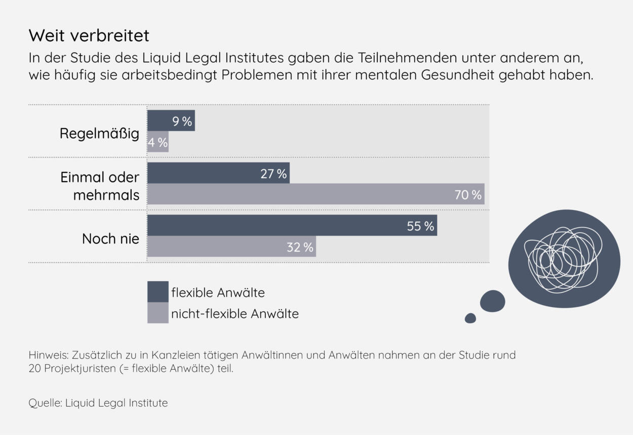 Das Liquid Legal Institutes (LLI) widmet sich der Transformation des Rechtssektors. Weil es bislang keine Daten aus Deutschland gab, hat es selbst eine Umfrage angestoßen. Es entstand eine repräsentative Studie mit rund 150 Teilnehmenden, die das LLI 2022 unter dem Titel ‚Lawyer Well-being: The Silent Epidemic‘ veröffentlichte. Darin gaben 70 Prozent der Befragten an, dass sie mindestens einmal in ihrer Karriere arbeitsbedingt Probleme mit ihrer mentalen Gesundheit hatten (Grafik: Weit verbreitet). Genauso viele kennen Kolleginnen und Kollegen, die damit zu tun hatten. Und 80 Prozent stimmten zu, dass der Umgang damit in der Rechtsbranche stigmatisiert sei.
