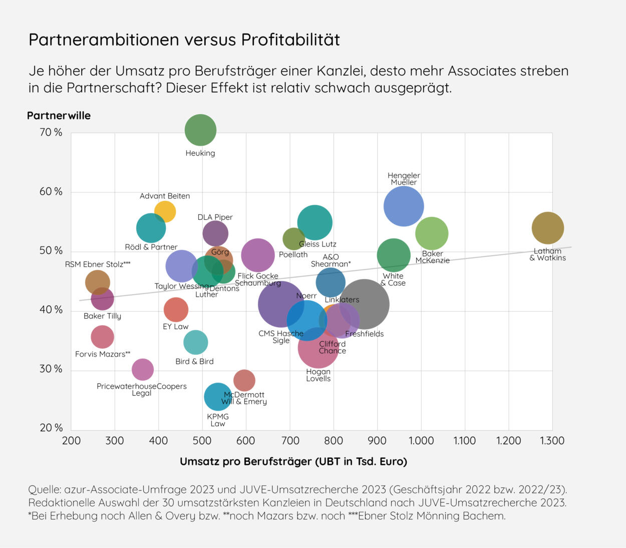 Interessant ist die Analyse des Zusammenhangs zwischen dem Partnerwillen und der Kanzleiprofitabilität anhand des Umsatzes pro Berufsträger (UBT). Je höher dieser Umsatz ausfällt, desto profitabler ist eine Kanzlei. Und je profitabler eine Kanzlei ist, desto mehr Geld können die Partner mit nach Hause nehmen. Die Grafik „Partnerambitionen versus Profitabilität“ veranschaulicht jedoch, dass die Karriereziele der Associates in den nach Gesamtumsatz führenden Kanzleien nicht zwingend mit dem zu erwartenden Verdienst zusammenhängen.