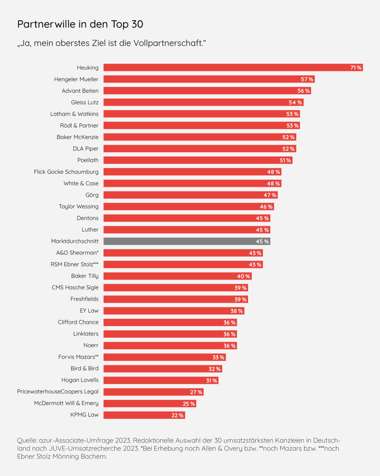 Für Kanzleien ist es elementar, in strategisch wichtigen Rechtsgebieten nicht nur leistungsstarke Partner zu haben, sondern auch für deren Verstärkung oder Nachfolge zu sorgen. Nach JUVE-Analyse sind die Karriereambitionen des Nachwuchses in den 30 umsatzstärksten Kanzleien sehr unterschiedlich ausgeprägt. Im Marktdurchschnitt haben rund 45 Prozent der Associates das Statement „Mein oberstes Ziel ist die Vollpartnerschaft“ bestätigt. Die Spanne liegt zwischen 22 und 71 Prozent (Grafik „Partnerwille in den Top 30″). Mit Abstand am höchsten ist der Wert bei Heuking, der Abstand zur zweitplatzierten Kanzlei, Hengeler Mueller, ist ziemlich groß. Am unteren Ende der Skala mit Werten von unter 30 Prozent befinden sich neben der US-Kanzlei McDermott Will & Emery die multidisziplinären Einheiten KPMG Law und PricewaterhouseCoopers Legal.