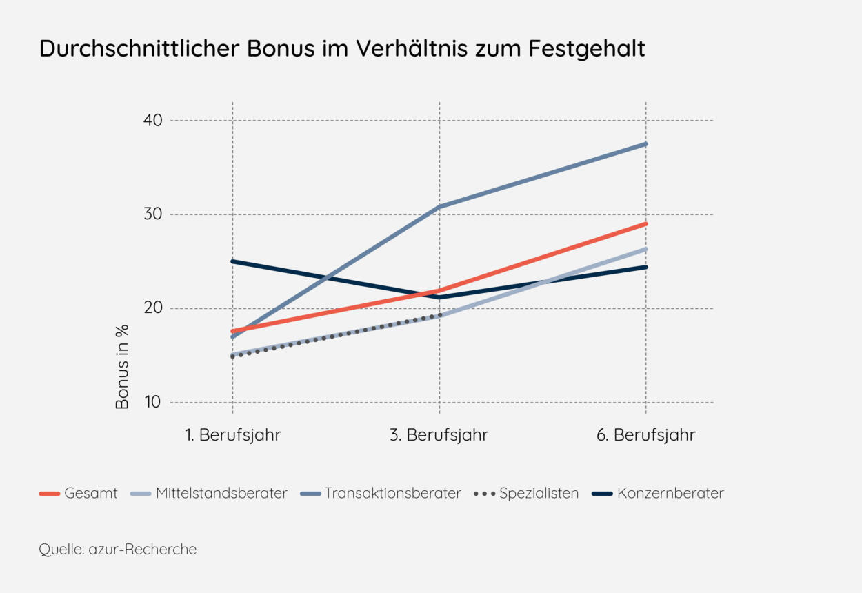 Für den Berufseinstieg locken die Kanzleien mit hohen Gehältern. Dafür erwarten sie Leistung, die sich aber schon bald in der Bezahlung niederschlägt. Bereits im dritten Berufsjahr kann der mögliche Bonusanteil durchschnittlich mehr als 20 Prozent im Verhältnis zum Festgehalt ausmachen. Je nach Geschäftsmodell sogar noch deutlich mehr.