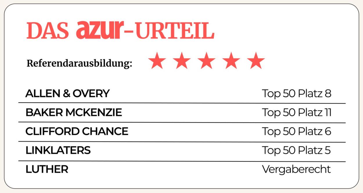 Die Qualität der Fünfsternekanzleien schlägt sich auch in den Kommentaren nieder, die in der azur-Bewerberumfrage gemacht werden. Ein ehemaliger Linklaters-Referendar lobt die „sehr gute Ausbildung“ und die „tolle Unterstützung bei der Examensvorbereitung“, ein anderer hat besonders von dem Weiterbildungsprogramm profitiert, das Linklaters eigentlich für ihre Associates aufgesetzt hat. Bei Baker McKenzie lobt ein Ehemaliger die „spannenden Fälle“, an denen er beteiligt war, und dass auf „geregelte Arbeitszeiten stark geachtet“ wurde. Die Arbeitsatmosphäre bei Clifford Chance beschreibt ein anderer Umfrageteilnehmer als „hervorragend, auch der Kontakt mit den Partnern war locker und freundlich“. Bei Luther lobt ein Ex-Referendar „eigene Kurse zur Examensvorbereitung“ und die „Klausuren-Flat für Kaiser-Klausuren“ sowie die direkte Einbindung in die Mandatsarbeit. Auch ein ehemaliger Allen & Overy-Referendar lobt die Anwaltsstation als „sehr gut“.